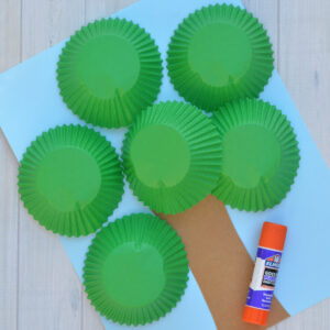 2. Glue cupcake liners to the paper to form the top of the apple tree. We used six green cupcake liners.